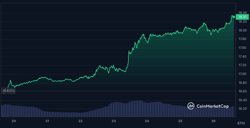 With BTC dominance being stagnant, the BTC/ETH ratio is trending upwards to 18.3 ETH per BTC, underlining that BTC continues to be king in crypto, and that alts like ETH are not gaining momentum against BTC.