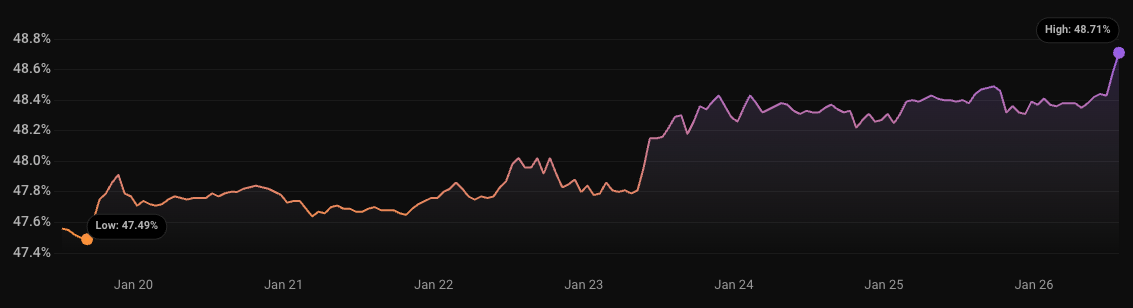 Bitcoin dominance has been somewhat stagnant this week, starting at 47.5% ending the week at 48.7%. It seems that capital initially this week flew to Bitcoin as the BTC spot ETF was getting approved, and then either moved back or continued over to altcoins like ETH, where capital usually flows to up until when Bitcoin dominance has peaked and starts to decrease, moving capital into more risky mid- or low-cap coins.